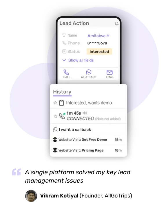 Interaction tracking: You can track the entire interaction history — from call recordings, WhatsApp messages and emails to follow-ups scheduled and undertaken