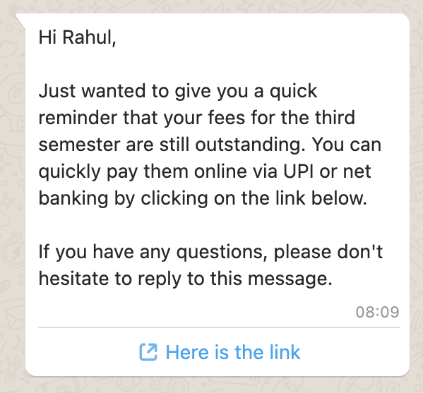 Just wanted to give you a quick reminder that your fees for the third semester are still outstanding. You can quickly pay them online via UPI or net banking by clicking on the link below.