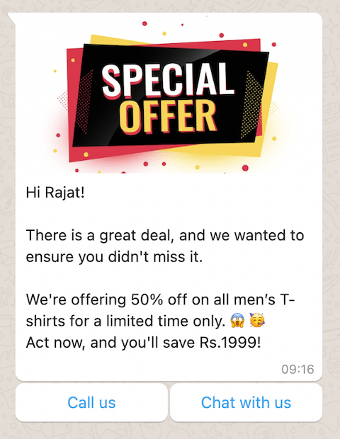 This WhatsApp promotion message template is ideal for promoting a specific product or service for existing customers or driving traffic to a landing page.