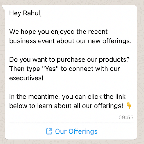 Do you want to purchase our products? Then type "Yes" to connect with our executives! In the meantime, you can click this link to learn about all our offerings!The personal touch in this template is the game changer. When the customer gets a message that is so specific, they feel valued and the chances of conversion thereby become higher.